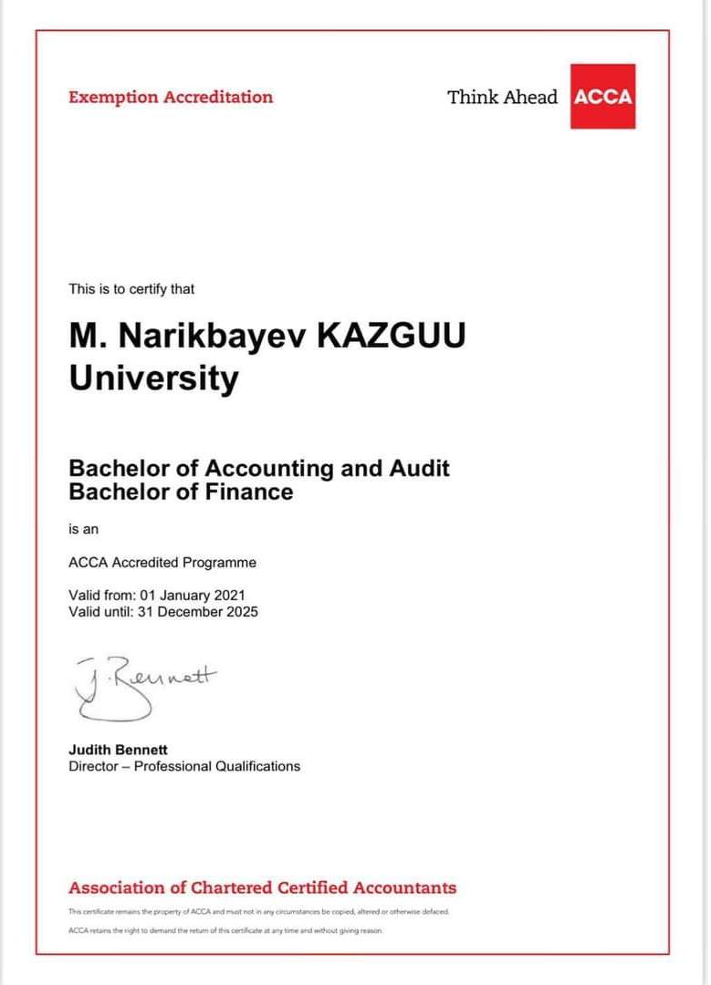 «2020 жылы 58 түлек АССА емтиханында университеттер тапсыруы керек 9 құжаттың барлығынан босатылды. 53 бітіруші ACCA «Accelerate» стипендиялық бағдарламасына іріктелді. Аталған аккредиттеуге кіретін курстарды (пәндерді) шетелдік университеттердің түлектері, АССА сертификатының иегерлері және сертификациясын аяқтап жатқан кандидаттар оқытады. Бұл талаптың барлығы оқытушыларды таңдау кезінде маңызды», — дейді  КАЗГЮУ Экономика Жоғары мектебінің директоры Сәуле Кемелбаева.